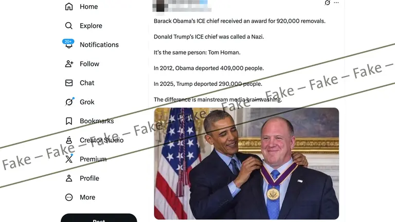 Im Netz kursiert ein Foto, das zeigen soll, wie der frühere US-Präsident Barack Obama Tom Homan, heute Grenzschutzbeauftragter der Trump-Regierung, mit einer Medaille auszeichnet. Das Bild wird genutzt, um Obama und Trumps Migrationspolitik gleichzusetzen. Recherchen zeigen jedoch: Das Foto ist manipuliert und mit hoher Wahrscheinlichkeit KI-generiert.